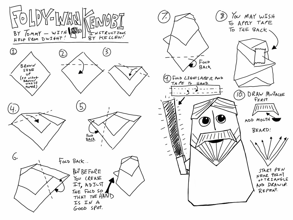 Hi tom, How do you fold the origami foldy wan? i want to make it myself and show it to my friends. i am a lonely kid in school so can you send a tutorial picture to impress them? Thanks.