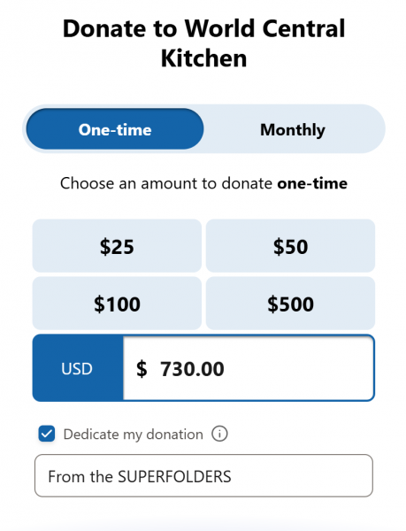 73 entries x $10 (from Webmaster Sam) = $730 for World Central Kitchen!!!!