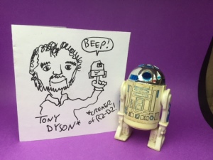 Sad news today, Superfolders. Tony Dyson has passed away. Dyson, along with Ralph McQuarrie, of course, created R2D2. Here’s a picture of him with Art2D2, along with what I’m pretty sure is my first — OF MANY — R2.