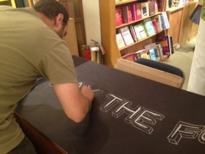 Pictures of the finished window display coming soon!!! Here’s the BEFORE picture… And look at the special guest they got to do the lettering: Jason Rosenstock!!!! The very same artist that does the covers!