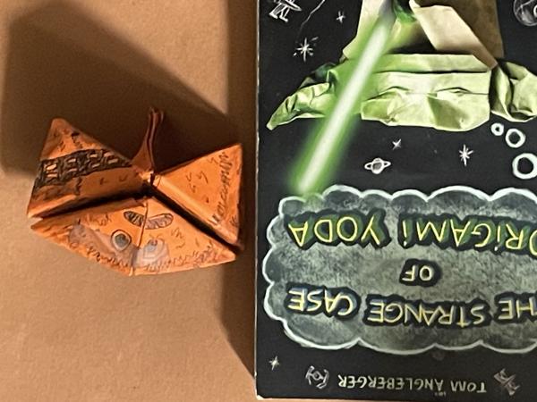 Okay so yesterday ( which was my birthday!!) my friend showed me this awesome Chewbacca fold he made. It’s a little different than the fortune wookiee, but I think it’s a little bit better than the original. I also got a copy of the first book at a thrift store because I gave my original copy to one of my friends, and I needed a new copy. Anyways, thanks to Anthony for this stooky fold!!!!!