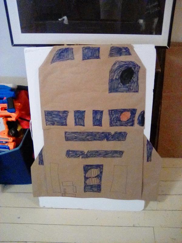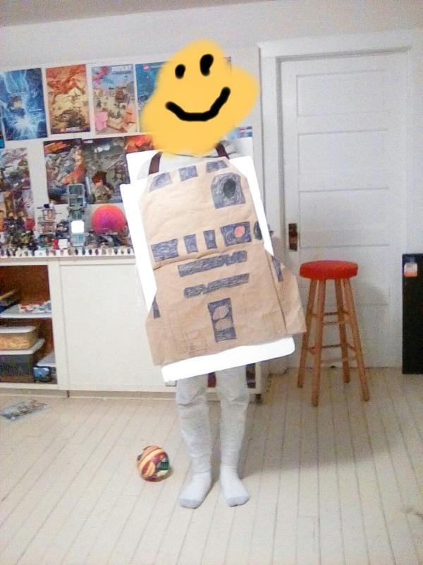 This is my Art2-D2 sandwich board costume. The A2-D2 is from his case file. Please excuse the ball in the photo.
