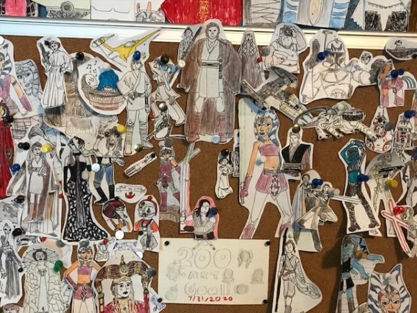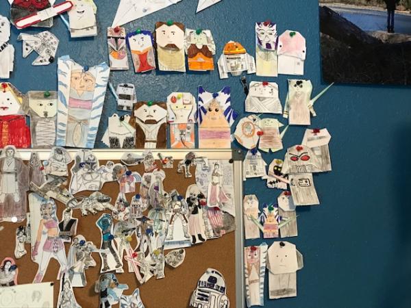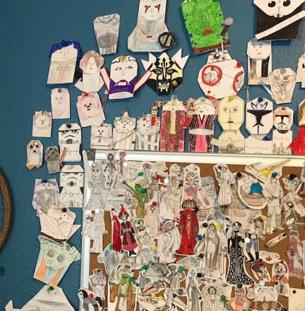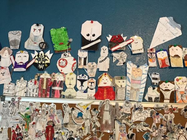 Yay! I’ve finally reached my new goal of 200 Star Wars art pieces, and this time I have 64 origami, which is 32% origami. Today I’m not adding a list of all the ones I did, since it would take forever, but here they are in the pictures I took. Enjoy! (The 2 triangle shaped things near the top are kirigami Star Destroyers…instrux maybe coming soon.