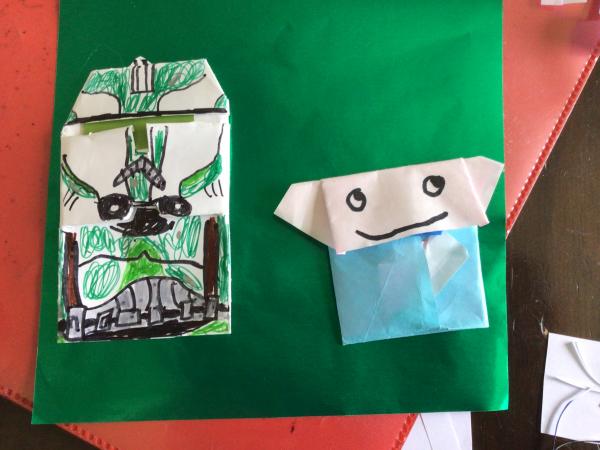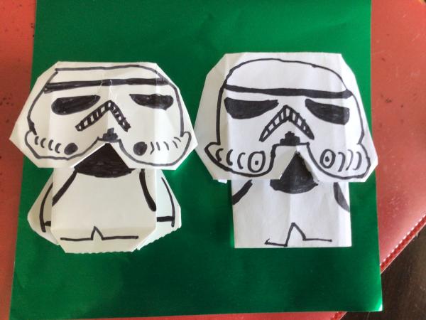 The Snot trooper is from SF Con, the Shiny Yoda is the classic fold, the two stormtroopers are Tom’s Stormtrooper fold, Stormtrooper helmet is also Tom’s fold, Commander Gree is a edited Mandolorian/Boba Fett fold from Tom’s video, but the Boba Fold helmet is my own design and if I get 3 Epic’s then I’ll post instrux, and I will post it in color soon.