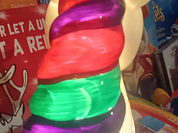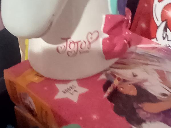 This is a Jojo siwa Lamp I have 1 photo with it off 1 photo with it on 1 photo with it on in the dark 1 photo with the main off 1 photo with Maineon you can see that you can see The brush strokes I was a huge fan of Jojo siwa cause I thought she was my age turns out she’s like 48.