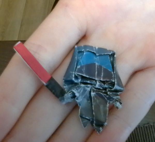 SuperFolder Williamkenobi I whipped this thing up pretty quick using a piece of scrap paper (it was somehow a perfect square) intending for it to be a paper airplane. One piece of paper not including the lightsaber. Origami not Kirigami.