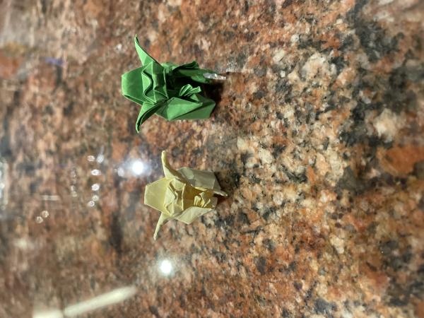 I was in class and I made Kawahata Yoda out of a post it note because I forgot how to make a crane but I memorized the instructions for yoda