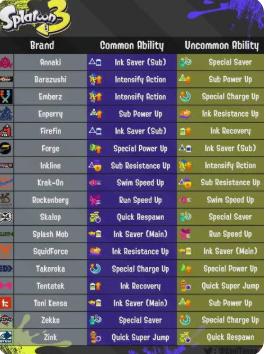 Comeback: For 20 seconds after respawning, boosts several abilities (Ink Recovery Up, Ink Saver Main/Sub, Swim/Run Speed Up, Special Charge Up).