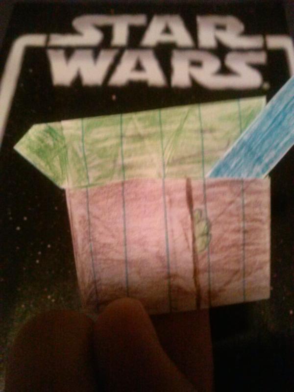 This is my same yoda, except he is on my finger this time, with a blue lightsaber I added. Next yoda moment, he is going to have a tiny glowstick for a lightsaber if I get 5 Stookys/Waffle-tastics, I will do it.
