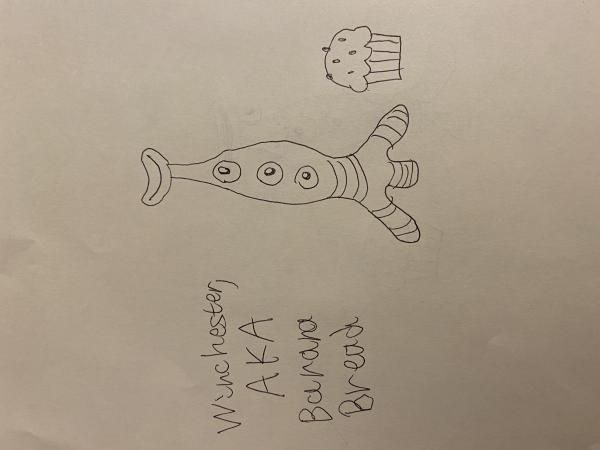 SuperFolder Jedisquirrel1138 My favorite character from Pixar is from Disney+’s monsters at work, and is named Winchester, but nicknamed banana bread. He is called banana bread because he brings banana bread into work every morning. I drew him next to a banana muffin.